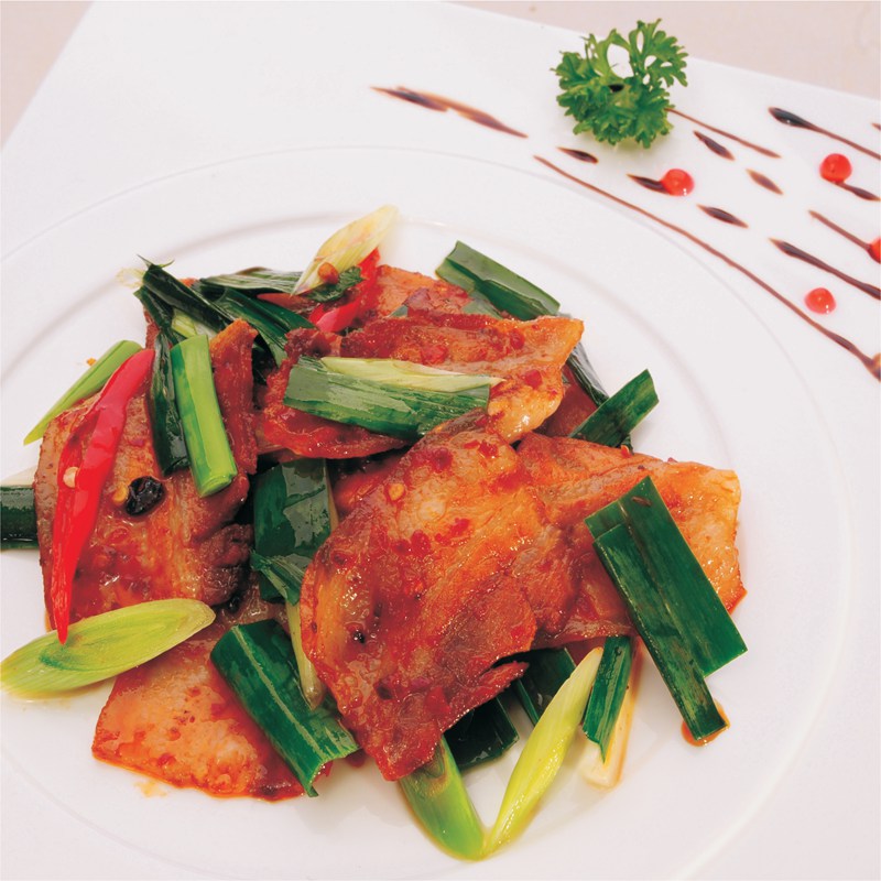 B炒鍋至火上,中火煎肉片起卷,加豆瓣炒香,下豆豉,甜面醬炒香,下蒜苗炒斷生出鍋,淋花椒油即