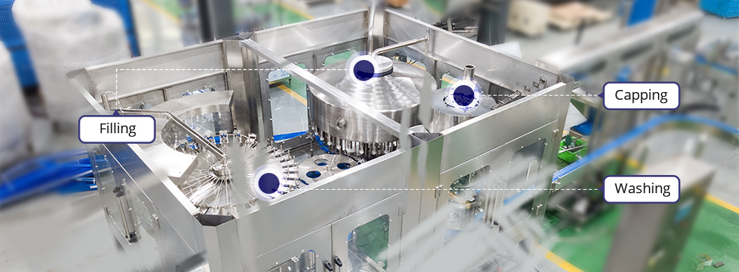 灌裝機主要用于灌裝飲用水。它結合了沖洗,灌裝和封蓋作為一個適用于PET或其他塑料瓶的自動化設備。采用新型常壓灌裝操作,使其能夠比其他同級別的機器更高效,更穩定地填充更多輸出。